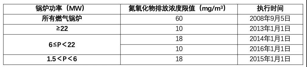 天津市2016年7月發布新標準DB12/151-2016《天津市鍋爐大氣污染物排放標準》,重新限定了燃氣鍋爐氮氧化物排放限值,新建燃油、燃氣鍋爐氮氧化物排放控制水平要求達到80mg/m3,具體氮氧化物的排放濃度要求見表7~8: