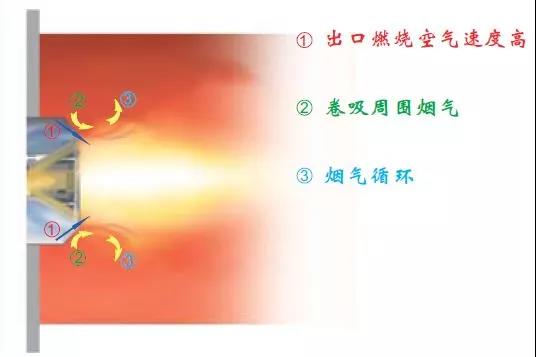 分級燃燒技術雖然可以一定程度降低氮氧化物的產生,但是很多燃燒器在實際使用中沒有完全實現助燃空氣和燃氣的充分混合,爐膛內存在局部高溫區,其溫度高于產生熱力型NOx的溫度,造成NOx濃度超標。另一方面,有可能出現燃料和空氣的混合流動不佳,造成一氧化碳超標,局部積碳等不完全燃燒的現象。為了降低反應溫度,需要盡可能使火焰分散,擴大火焰形狀,也就是說需要結合爐膛配合使用,而大多是情況是爐膛體積有限,為了避免火焰相對爐膛過大,通常會降低燃燒器的輸出功率,這樣可以降低NOx濃度及保證充分燃燒,但是缺點是鍋爐的功率下降了,而且有煙氣冷凝的風險。